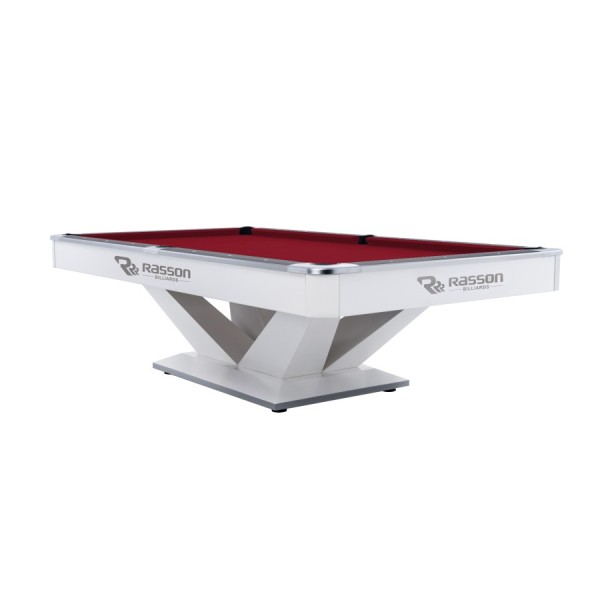 The Rasson Victory pool table features the unique pedestal and legs that look like a “V” from each side of the table. Victory is equipped with our own designed and patented SLS(Slate Leveling System) and LLS(Leg Leveling System) as well TPR material pockets.